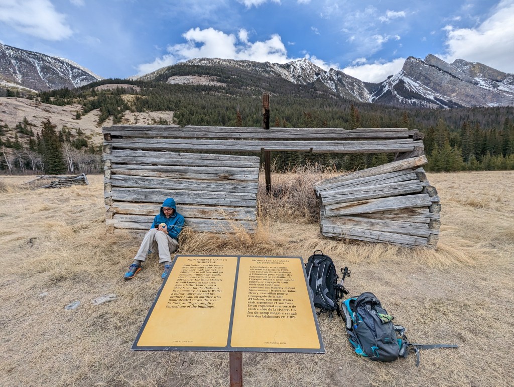 The Overlander trail is lower elevation (we gained 540 metres today, but it was all just undulating trail), has good views and is a pleasant shoulder season option. We hadn’t arranged a car shuttle between the two trailheads, so we decided to start at the more scenic side by Morro Mountain and just go to the historic Moberly Cabin and back.