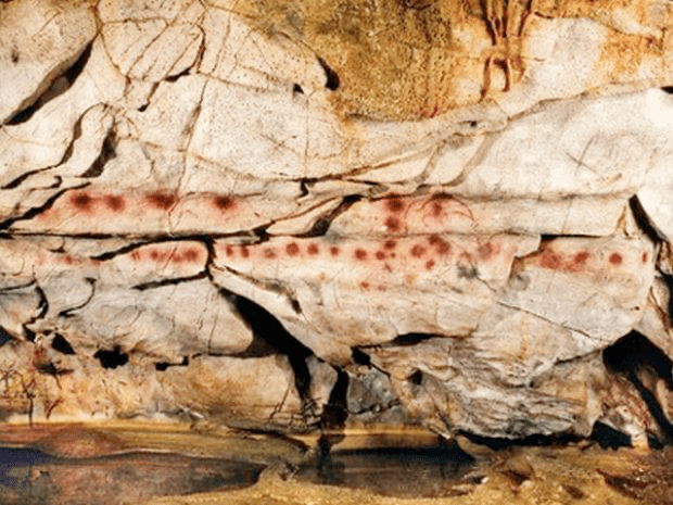 In a deep cavern that periodically floods, there is a long row of red dots. They are not perfectly in a line or evenly spaced or exactly the same size, but they are fairly orderly. What are they for? An accounting system? A record of water levels? A census? I will throw another possibility in the ring: they aren’t for anything. It became just an empty tradition with its own changing and arbitrary just-so story to justify itself. Let’s say they were all made in the same 5,000 year period (it could have been over a much longer or shorter span but we can’t date ochre itself so we only know that they are older than 25,000 years but not as old as 40,000). 5,000 years is such a long time that for most of that period, people’s traditions and stories about why they go and put their dot in the line would have been completely different than the original reason.