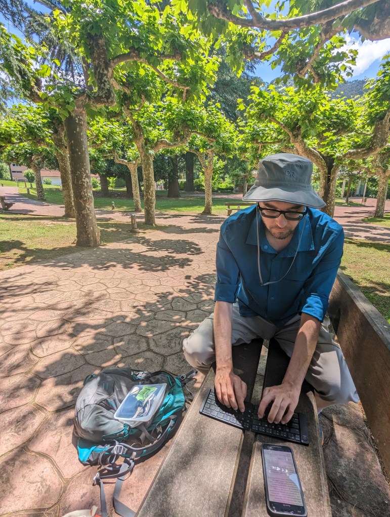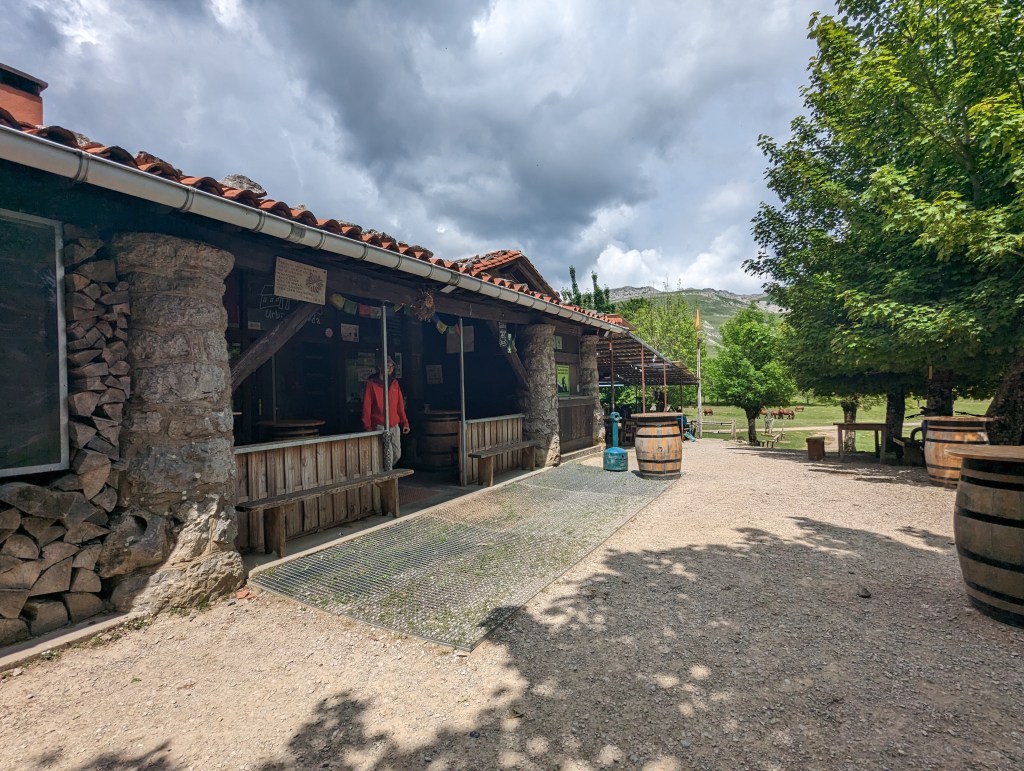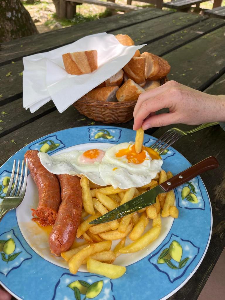 800 metres to go until the eatery, and we still weren’t even sure if it was open. The limited info I’d gotten from my pre-downloaded google maps seemed to think it would be, but we were in the dangerous “siesta” hours and we’d been heartbroken before. If it was closed, we’d be resigned to filling up on old oranges and tiny corn bars because at our current pace we wouldn’t reach the town until after all the restaurants shut down (and wouldn’t reopen until 8pm). I was kind of starting to limp a bit, but the surrounding thunder and encroaching dark clouds spurred us on. At last, it came into view. Groups of people were scattered around the many picnic tables on its lawn, and it was such a relief to see giant piles of bread and fries.