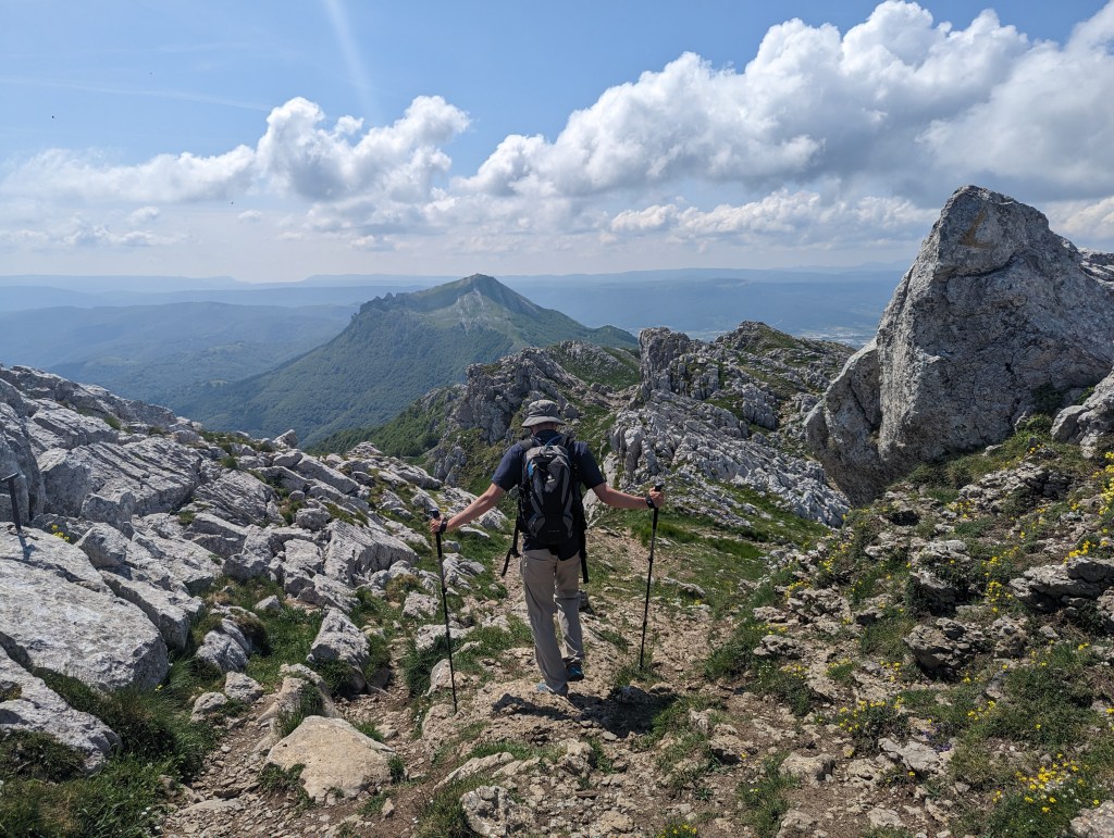 We continued along the ridge. The footing was still tricky, mostly made up of angular limestone cobble polished to a glassy shine by countless footsteps. The views made up for it. Though these are “only” big hills, the vistas they command are incredible because of their steepness. Farm and forest filled the valleys far below. We could see roads snaking their way between stone villages. Everything was vibrant and sharp under the early summer sun. Eventually, the ridge ended and we began a headlong plunge down through the forest. The shade came at the perfect time as the day had grown quite hot. We were feeling tired by the time it leveled out in a grassy clearing.