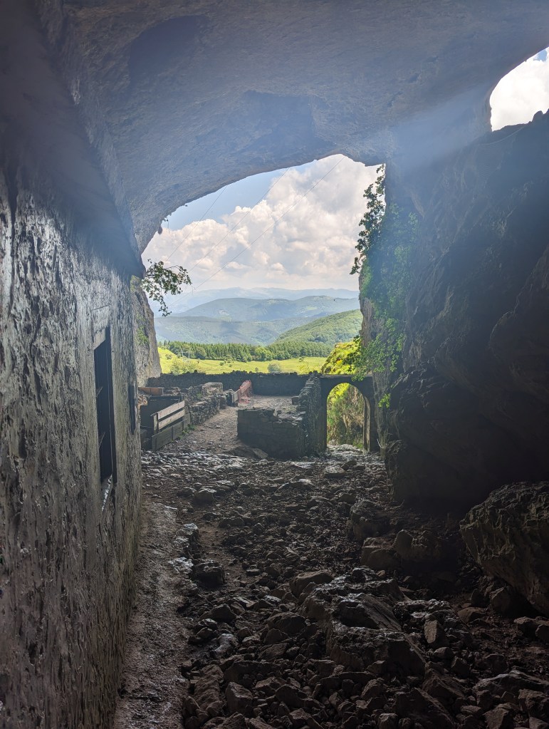 A wooden signpost marked a 4 way junction between several walking routes, including our old friend, the red and white stripe blaze. We continued down on a short side trip to see the Hermitage of San Adrian, a chapel built inside a large natural tunnel. The tunnel was neat. It is shaped like an almond, I guess 10 metres high in the centre and perhaps 30 meters wide. From the valley, wind rushed up through the tunnel to us. The chapel itself is essentially a shepherd’s hut with more grafitti and a generally unwholesome aura. Trash and signs of squatting and excavation made it feel more akin to being under a bridge in a rough part of a large city.