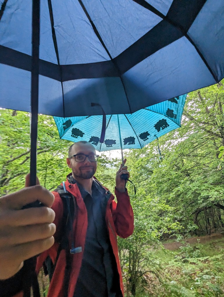 My foot was still pretty seized up when we left, but at least we were fed. The rain did arrive about fifteen minutes later, when the skies opened its jaws on us and spewed forth a giant, single waterfall. But there wasn’t a slant to it so standing in place with our umbrellas, nary a drop got on our pants.