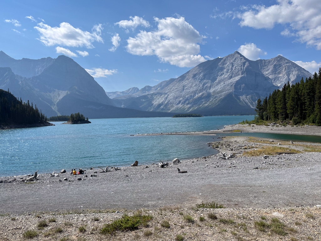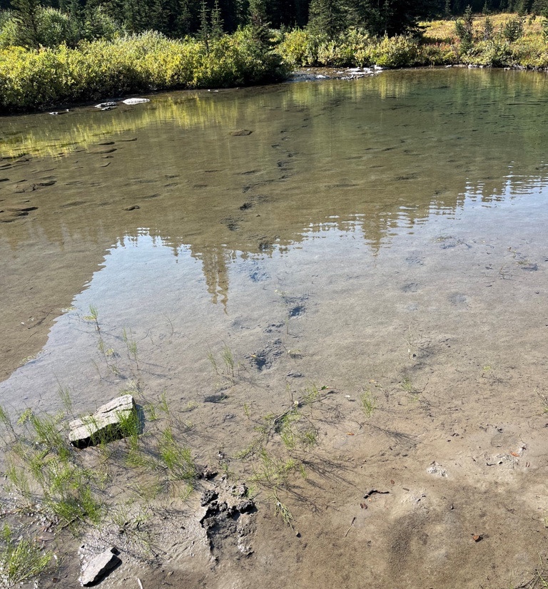 Bear tracks cross a lagoon from the fire ring, heading out to the meadow where I will sleep. I think about moving on. but I am tired and it is far to the first camp in Banff and I don’t like to stay without a reservation. I filter water and rest and drink and feel better. With returning strength comes confidence and I commit to staying.
