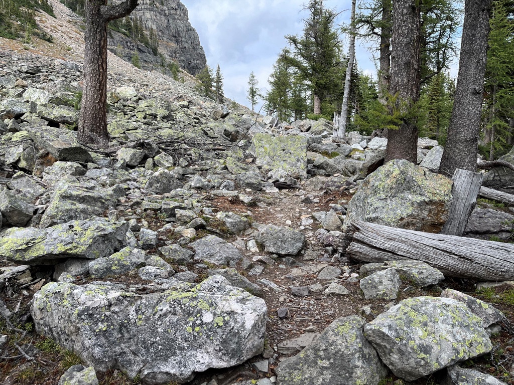 I remember the next part being very hard. Last year when Sabrina and I had done the first climb up to some lakes, it had felt punishingly steep. Loose rock and deadfall had made it exhausting even with only day packs. It is just has steep as I remember and though most of the deadfall has been cleared, the footing is still loose and eroded. I make steady progress at first but soon I am pausing to catch my breath every 5 minutes, and then every 2 minutes until finally I take my pack off and sit down.