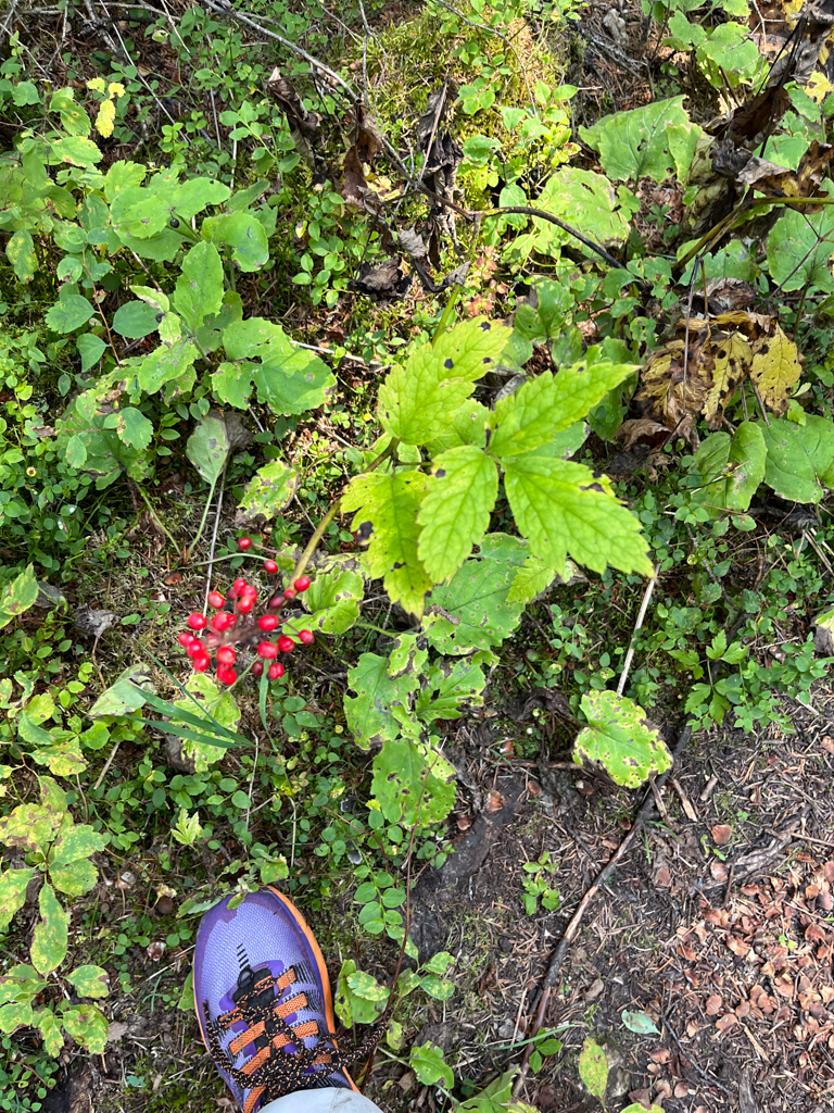 When I continue it is through a gently undulating forest. I walk north and the monotony of the afternoon makes it feel like a long time, then abruptly, my single track joins a wide gravel path. Within minutes I am passing other hikers every few hundred metres. I see one ahead. It might be the woman but I’m not sure. I’m walking just slightly faster than her but it takes a long time to catch up and she doesn’t turn around. I feel awkward, like I am following her on purpose. I clatter my poles on stones to make noise, like for a bear. I’m pretty sure it’s her by the time she turns around.