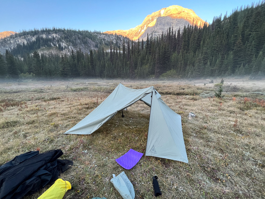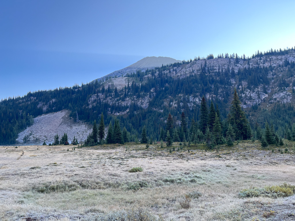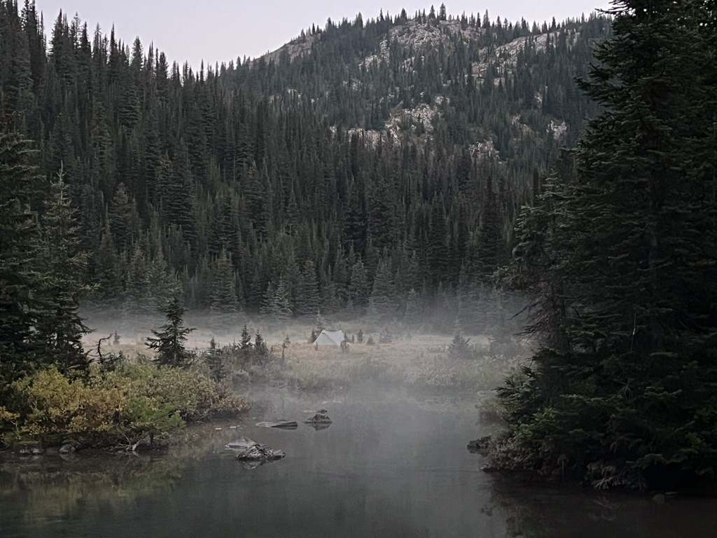 The sun dips below the peaks and it gets cold very quickly. Mists rise at the meadow. I crawl into my tent feeling lonely. I put my bear spray beside my pillow and practice reaching it. I wonder if it is better to yell or stay quiet if something comes sniffing. I toss and turn. I am very uneasy and cold.