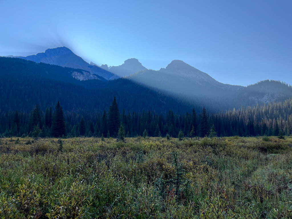 I know the willows of the descending valley will be wet but the day is losing its icy edge and I can see the sun-line creeping down to meet me. When I reach it, it is glorious. I sit down and bask in the warmth and feel good. It is a beautiful valley yellow with changing leaves and the morning sun. I’m alone save the circling birds and the prey they are looking for. I walk through knee-high grass passed an empty warden cabin. I pass trails leading left and right to silent campgrounds and lonely cols.
