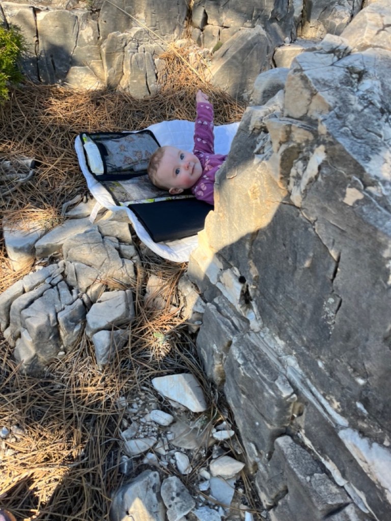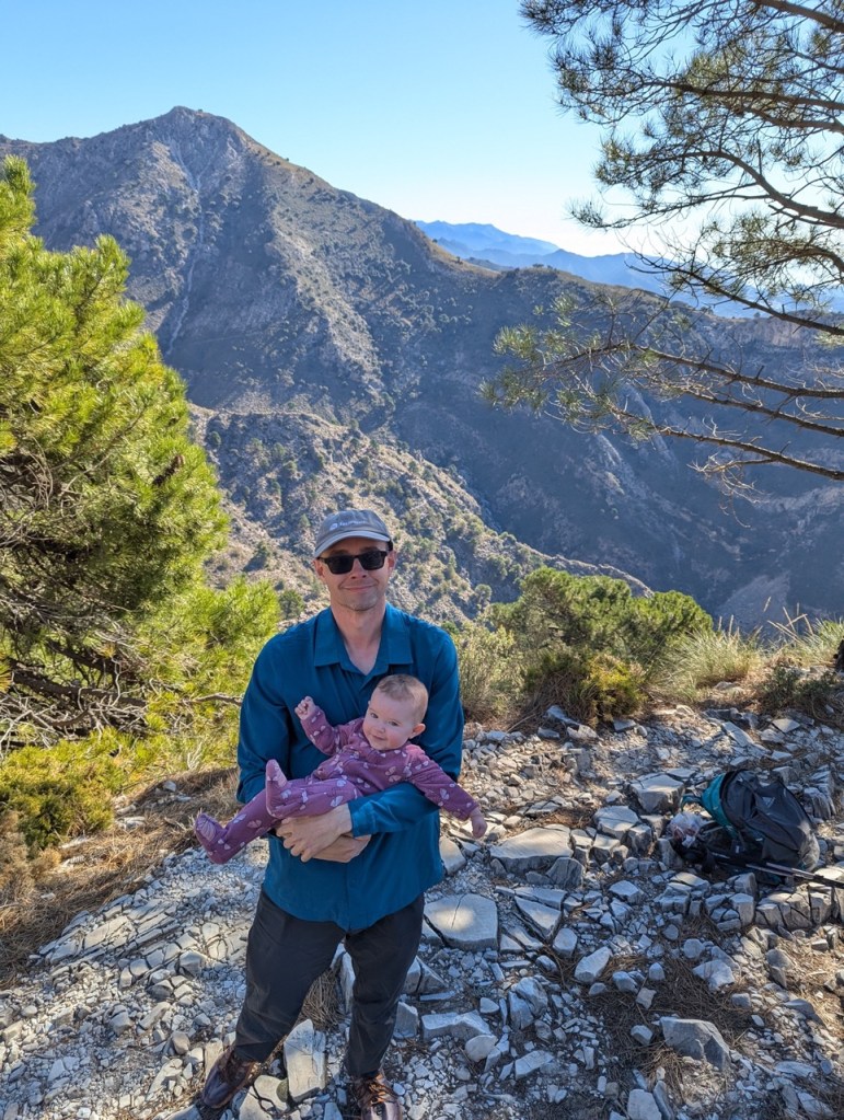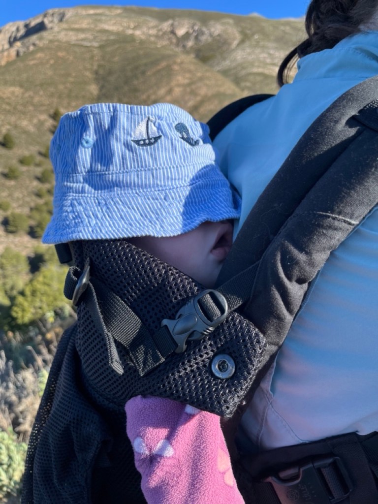 Ten minutes came and went. We’d hiked up to the Collado de Huerta Grande, with ambitions to make it a Big Day. The loop was our baseline, but we figured we’d be able to add on a significant lollipop tail to the route. Ellie’s crying jag changed that plan. We knew going into this travel month that there would be some plans that Ellie mostly would simply force us to abandon. But so far she’d spoiled us with her easygoing nature and carrier naps. But by the time Ellie started truly melting down on this hike, we were basically at the halfway point of the loop, with many kilometres and elevation between us and the car. So we kept going, knowing that she would likely eventually cry herself to sleep. Ten minutes was usually the max amount of time she’d cried in the carrier when fighting naps in the past. But when that marker passed and she was still screaming, we took her out again and I laid down on the ground in an attempt to side-feed her to sleep. It didn’t work. We were all doing a good job of staying calm — it used to be harder for me to weather Ellie’s crying if there were others around; I felt like maybe they were judging me, or judging Ellie. We put her back in the carrier and in a few more minutes she finally did fall asleep. Sweet relief. Not only for us, each of whom feels this tiny being’s wails in the core of our hearts, but for darling Ellie who was so tired.