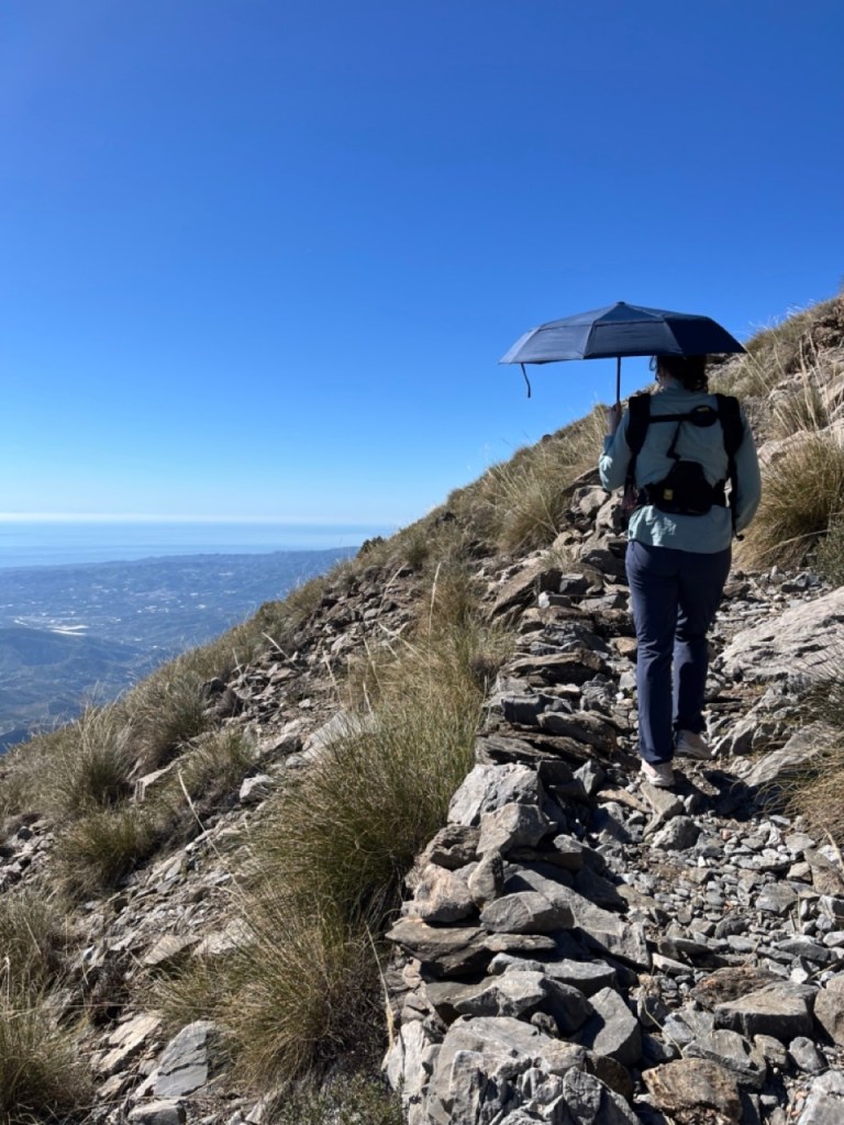 As the highest mountain in the range, La Maroma had piqued my interest early during the research phase. But I assumed that only Ben would see its summit. He was fit and strong, while I was… getting there. My postpartum progress had been going well, but I still had a long way to go. At 2,069 m elevation, the top of the mountain was roughly 22km and 1,500m away from our starting point of Canillas de Albeida. I’d been previously topping out at 10km hikes. So with Ellie on my back I figured we’d go as far as we could before waving bon voyage to Ben (with only 11 hours of daylight at our disposal, and two hours of commute, we’d decided to keep the attempt team lean and go as fast as we could). We left home a half hour later than planned, at 8:30am, after doing final-ok-actually-final-ok-FINALfinal Zoleo checks.