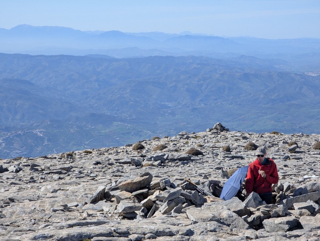 The Roof of Malaga is a vast flat stone plateau. It is so big and flat that I had to walk a couple hundred meters from the “summit” to be able to see more than just sky over the far end. While Ellie fed, I wandered around the windy rockscape, peering this way and that. Snowcaps to the east, farmland to the north, valleys and lakes to the west, and the sky merging into the sea far to the south. I returned and ate my sandwich with Ellie while Sabrina took a quick look around. It was a struggle to keep her sheltered from the sun while the wind buffeted the umbrella this way and that.