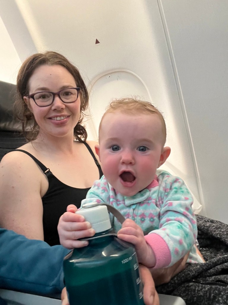 At last we boarded our flight west, the longest of the trip since we’d be against the jet stream. We didn’t bother with a bassinet this time, since Ellie didn’t nap securely unless she was being cradled against a warm body. She was quite happy lounging on the floor behind the bulkhead, until a wicked and foolish flight attendant informed us that this was interdit. We were huffy because of course if there was turbulence causing the baby to become airborne, we would easily catch her before any harm could be done.