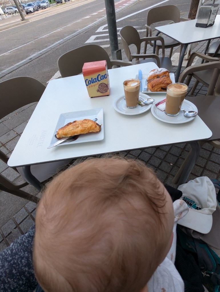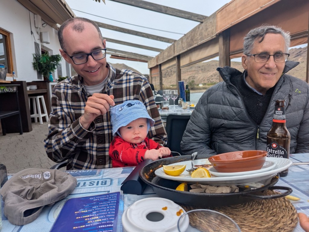 From our open-air table overlooking the beach, we squinted at the sandwich board listing the menu options. Photos were taken discretely to be zoomed in by hand. The waitress was questioned but she didn’t speak English and wasn’t fussed to make an attempt (meanwhile, our pitiful stumbling through the native language was embarrassing for all involved). Eventually most of us landed on steamed mussels for the primero, and fried fish for the segundo, with some ordering paella to share. Ellie had been doing well but once the food arrived her grabby little hands necessitated that we take turns walking her along the boardwalk. At one point while on Ben’s lap, Ellie suddenly lunged, wrapped two fists around the giant paella dish handle, and in one swift tug brought it to the table’s edge.