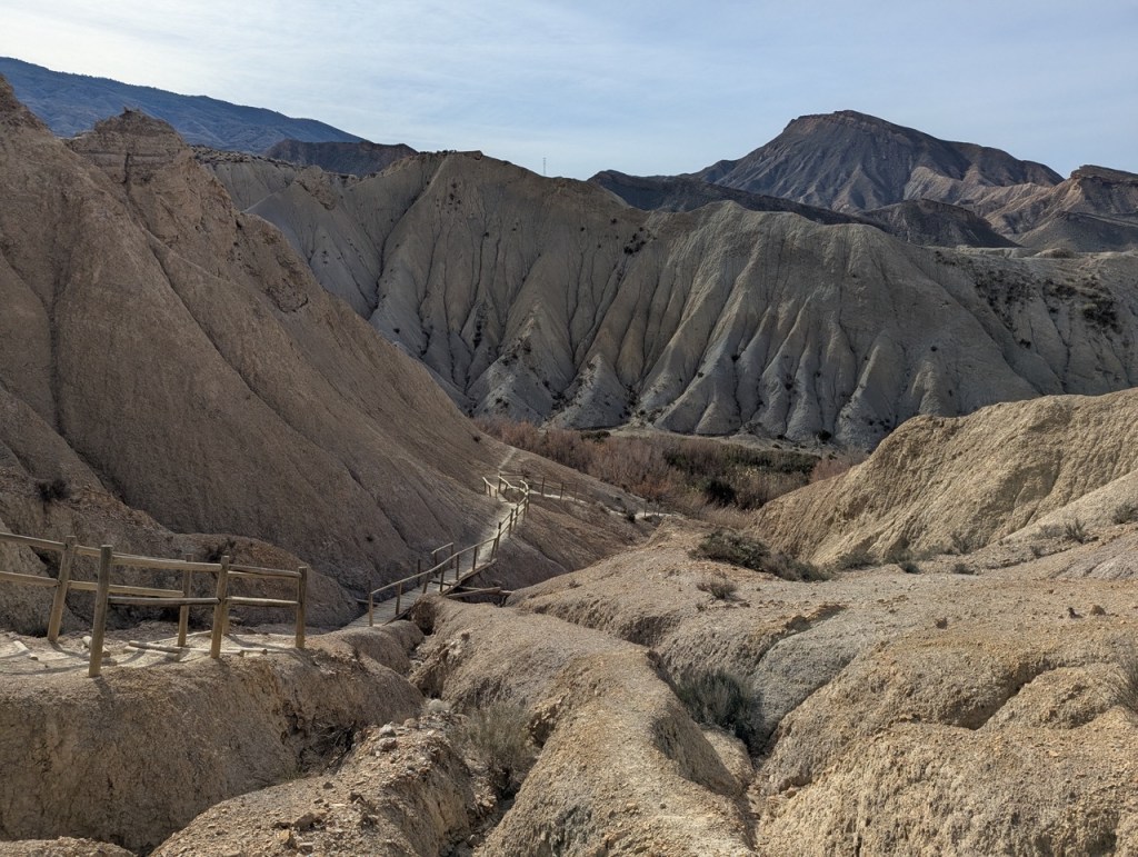 I liked the winding, sun-bleached wood stairs that led down into the gulch. I liked the “dragon scale” rock formations, which were chunky, regular, and at a foppish tilt. Plodding along a valley does not thrill me. I want to stand on a great height and see the valleys from above and everything else around besides. I want to climb something so big I am made smaller until I almost disappear, dissolved in the sky. But I’m glad you mixed a few things like this in for variety. The cuevos, La Mezquita, otra vez, so that the trip was not too samey-samey. High points need low points to stand out.